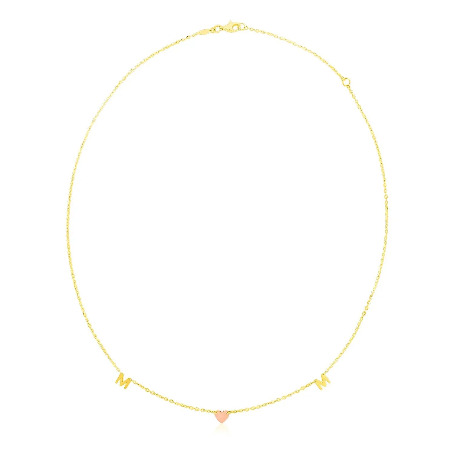 A sweet heart of rose gold contrasts beautifully with yellow 14k two tone gold in this heartfelt inchesMom inches necklace. Necklace is 18 inches long and closes with a lobster clasp.