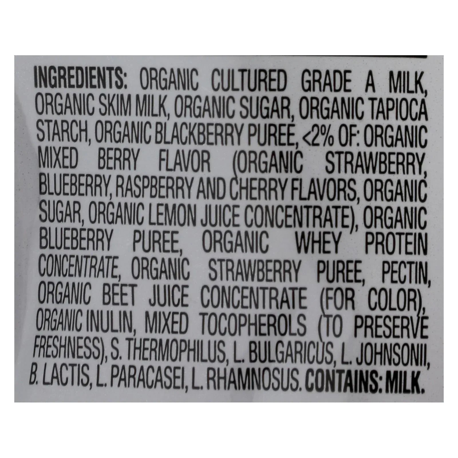 ingredients : organic cultured grade a milk;organic grade a skim milk;organic sugar;organic tapioca starch;<2% of: organic blackberry puree;organic mixed berry flavor;organic strawberry;blueberry;raspberry and cherry flavors;organic lemon juice concentrate;organic blueberry puree;organic strawberry puree;pectin;organic beet juice concentrate;for color;organic inulin;mixed tocopherols;to preserve freshness;s. Thermophilus;l. Bulgaricus;l johnsonii;b. Lactis;l. Paracasei;l rhamnosus