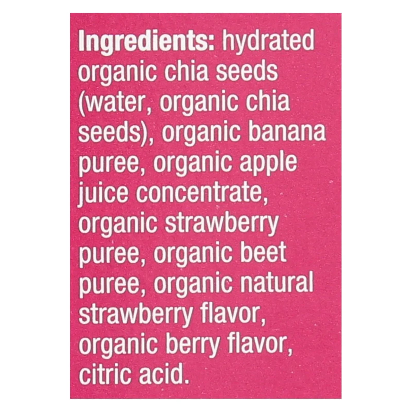 ingredients : hydrated organic chia seeds (water, organic chia seeds);organic banana puree;organic apple juice concentrate;organic strawberry puree;organic beet puree;organic natural flavors;citric acid