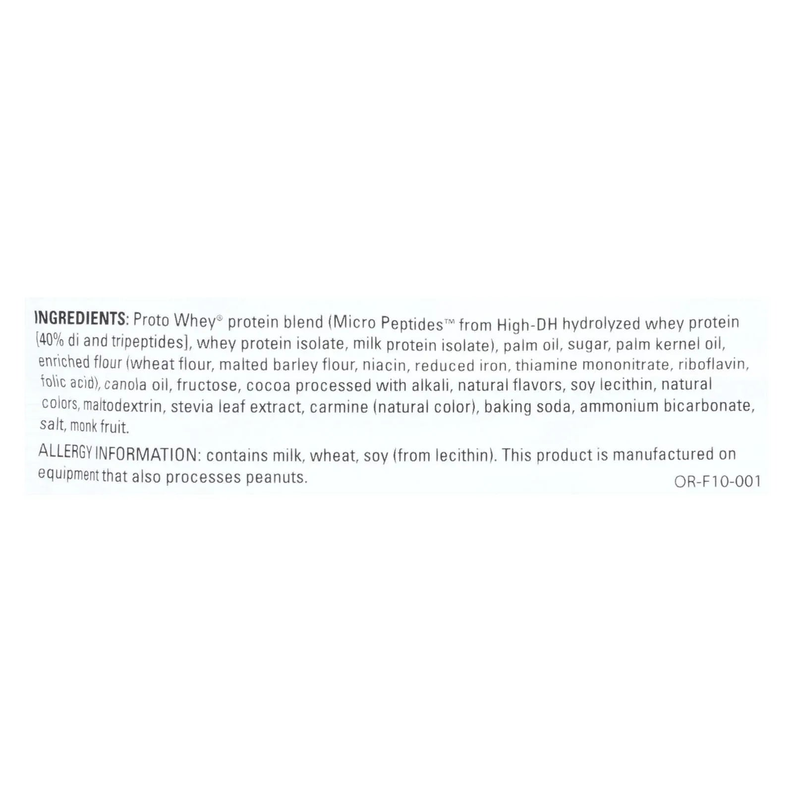 ingredients : proto whey® protein blend;micro peptides™ from high-dh hydrolyzed whey protein [40% di and tripeptides];whey protein isolate;milk protein isolate;palm oil;sugar;palm kernel oil;enriched flour;wheat flour;malted barley flour;niacin;reduced iron;thiamine mononitrate;riboflavin;folic acid;canola oil;fructose;cocoa processed with alkali;natural flavors;soy lecithin;natural colors;maltodextrin;stevia leaf extract;carmine;natural color;baking soda;ammonium bicarbonate;salt;monk fruit