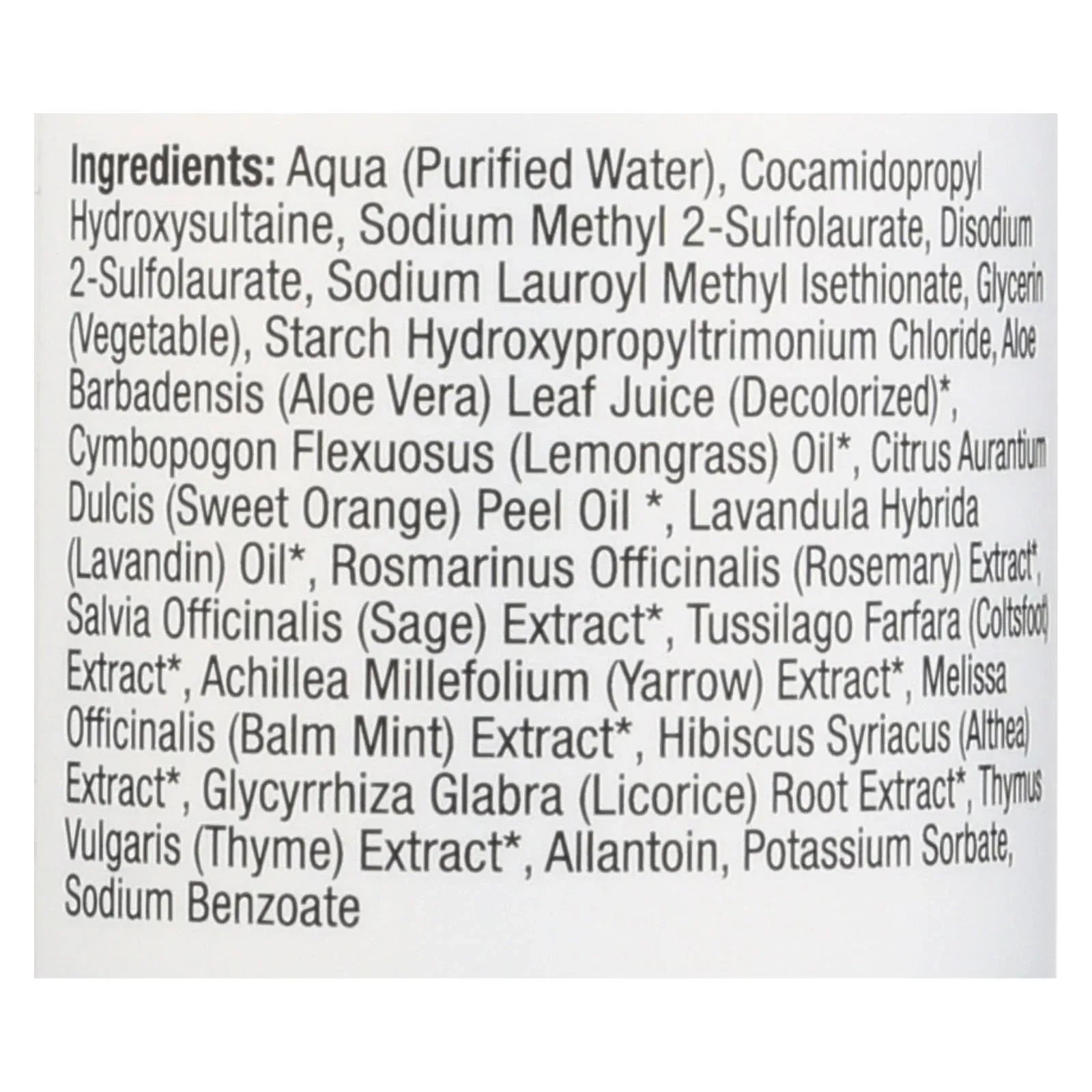 ingredients : aqua;purified water;cocamidopropyl hydroxysultaine;sodium methyl 2-sulfolaurate;disodium 2-sulfolaurate;sodium lauroyl methyl isethionate;glycerin;vegetable;starch hydroxypropyltrimonium chloride;aloe barbadensis;aloe vera;leaf juice;decolorized;cymbopogon flexuosus;lemongrass;oil;citrus aurantium dulcis;sweet orange;peel oil;lavandula hybrida;lavandin;rosmarinus officinalis;rosemary;extract;salvia officinalis;sage;tussilago farfara;coltsfoot;achillea millefolium;yarrow;melissa officinalis;balm