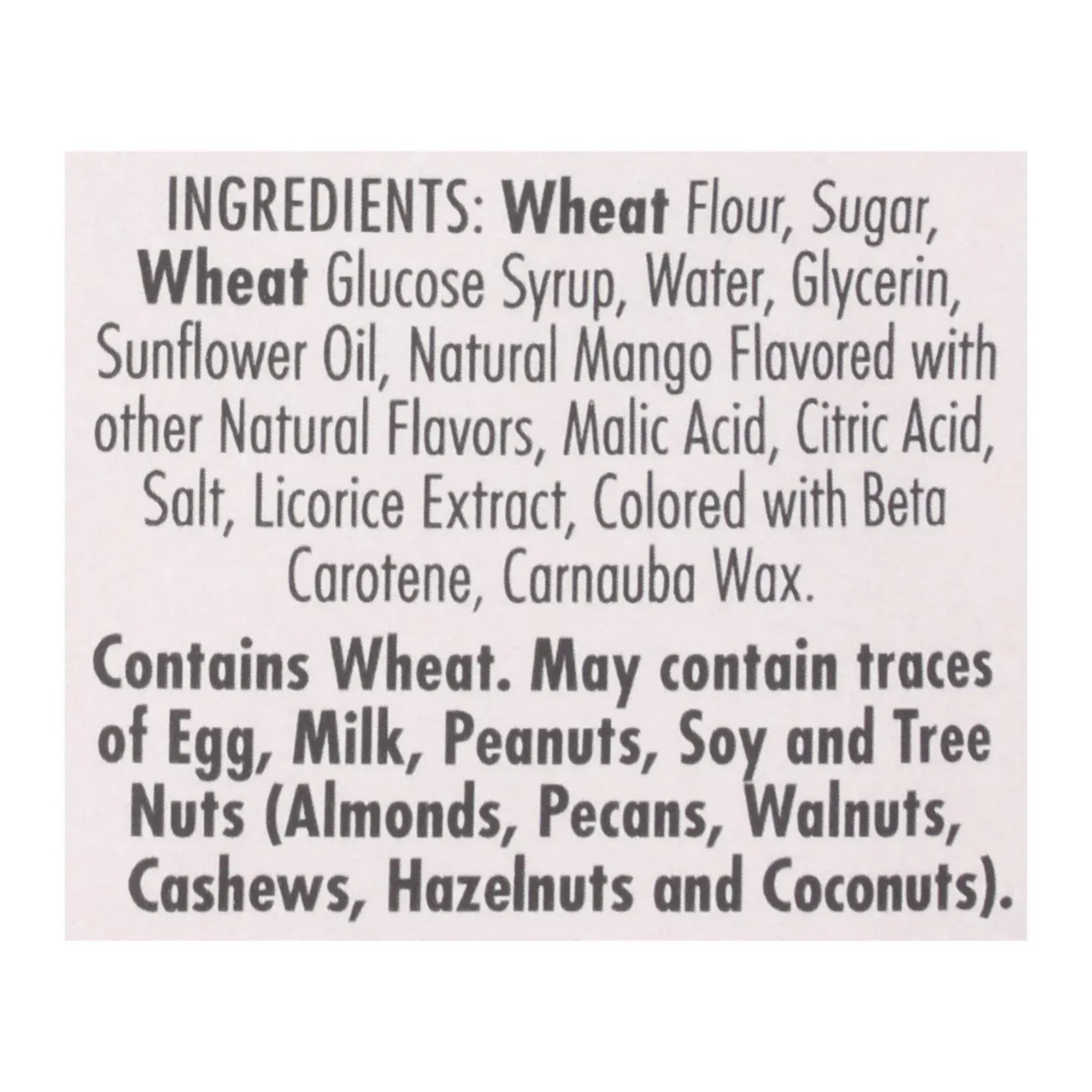 ingredients : wheat flour;sugar;wheat glucose syrup;water;glycerin;sunflower oil;natural mango flavored with other natural flavors;malic acid;citric acid;salt;licorice extract;colored with beta carotene;carnauba wax