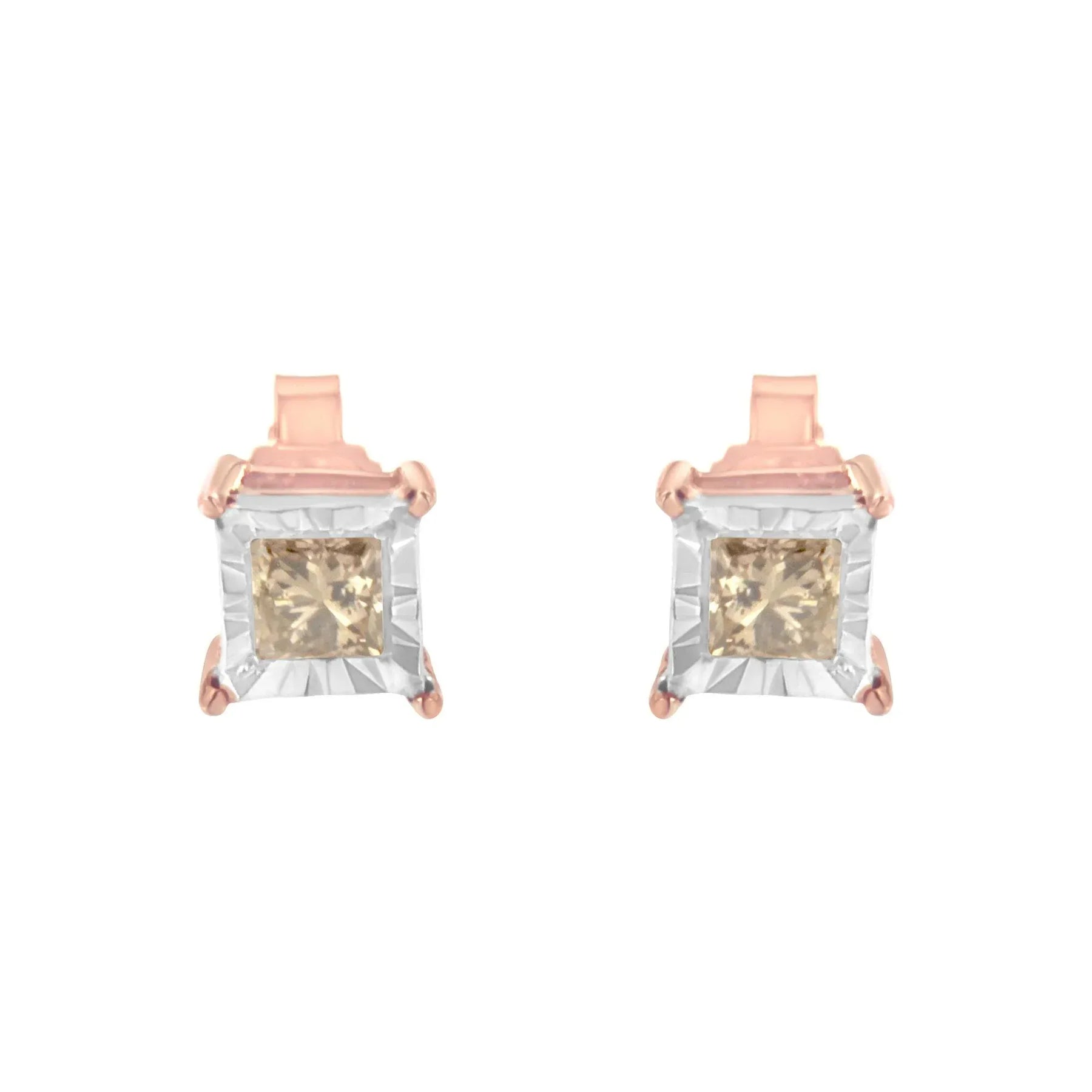 14K Rose Gold Plated Two-Tone .925 Sterling Silver 1/2 Cttw Princess-Cut Square Diamond Solitaire Miracle-Plate Stud Earrings (K-L Color, I2-I3 Clarity)