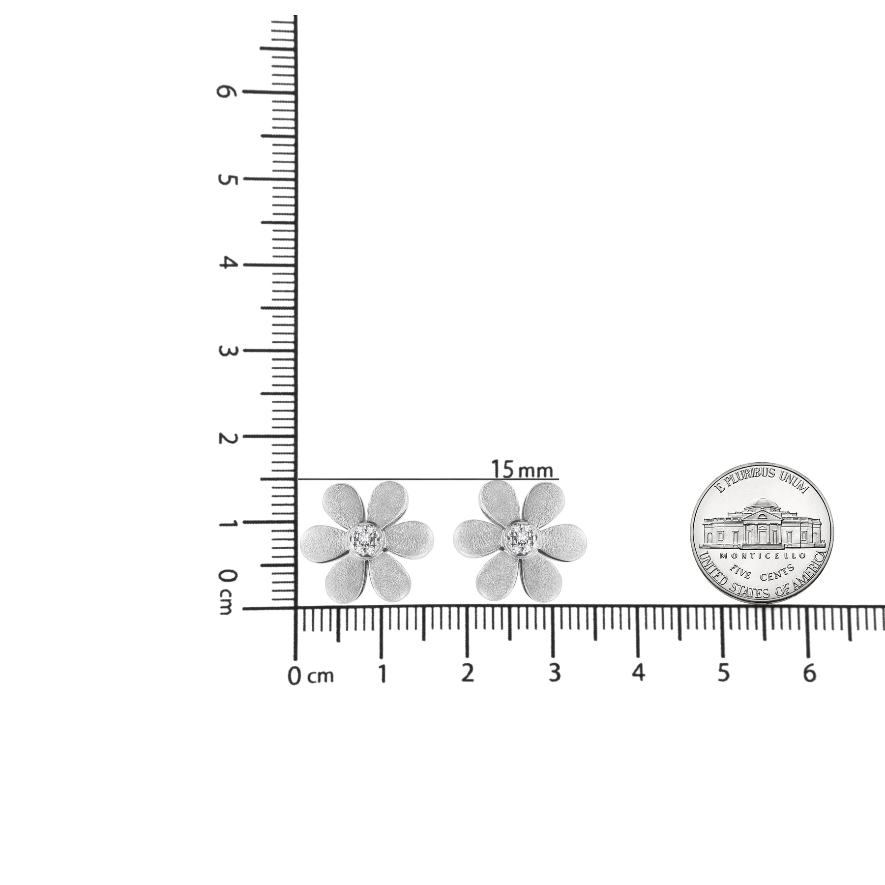 Celebrate your blooming love with these adorable diamond flower earrings made from .925 sterling silver and given a matte finish. Charming style for your sweetheart, these sterling silver floral earrings are embellished by a cluster of 10 pave set single cut accent diamonds at the center. These blossoms closes with a secure clasp. Total diamond weight is 1/20 ctw.