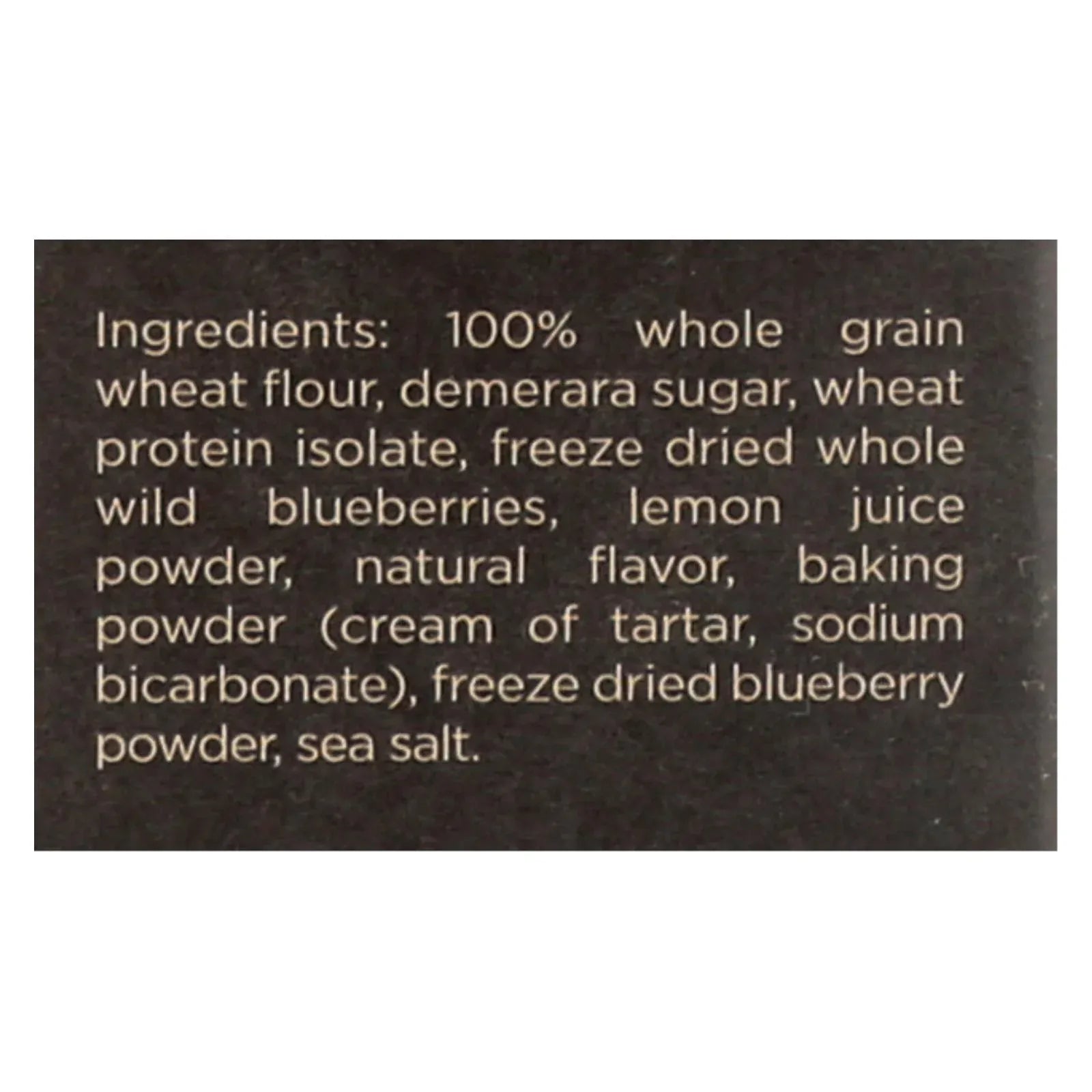 ingredients : 100% whole grain wheat flour;demerara sugar;wheat protein isolate;freeze dried whole wild blueberries;lemon juice powder;natural flavor;baking powder;cream of tartar;sodium bicarbonate;freeze dried blueberry powder;sea salt