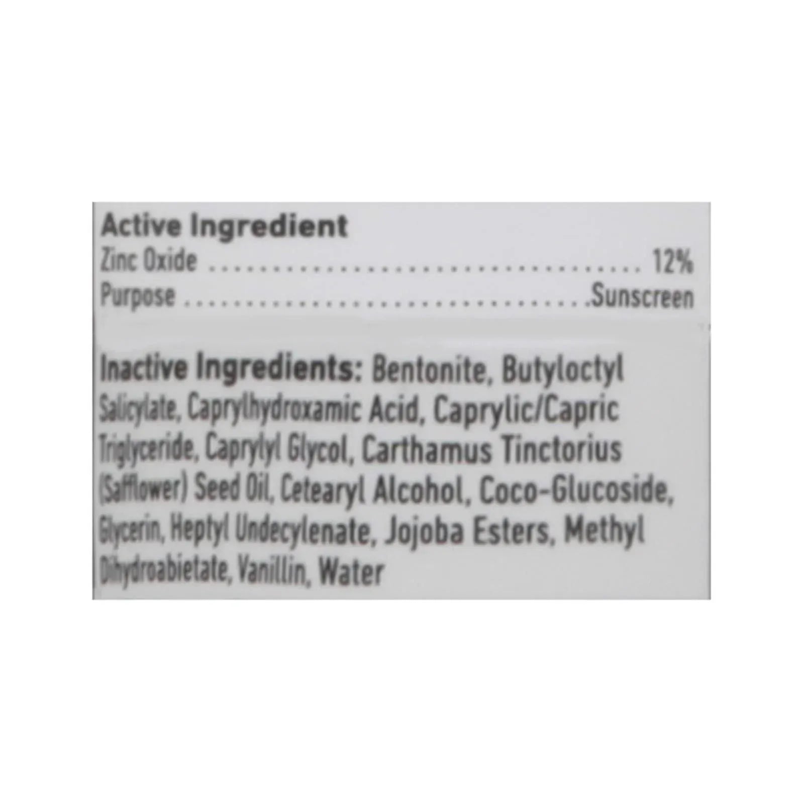 ingredients : zinc oxide 12% purpose sunscreen;bentonite;butyloctyl salicylate;caprylhydroxamic acid;caprylyl glycol;carthamus tinctorius;safflower;seed oil;cetearyl alcohol;coco-glucoside;glycerin;heptyl undecylenate;jojoba esters;methyl dihydroabietate;vanilla;water