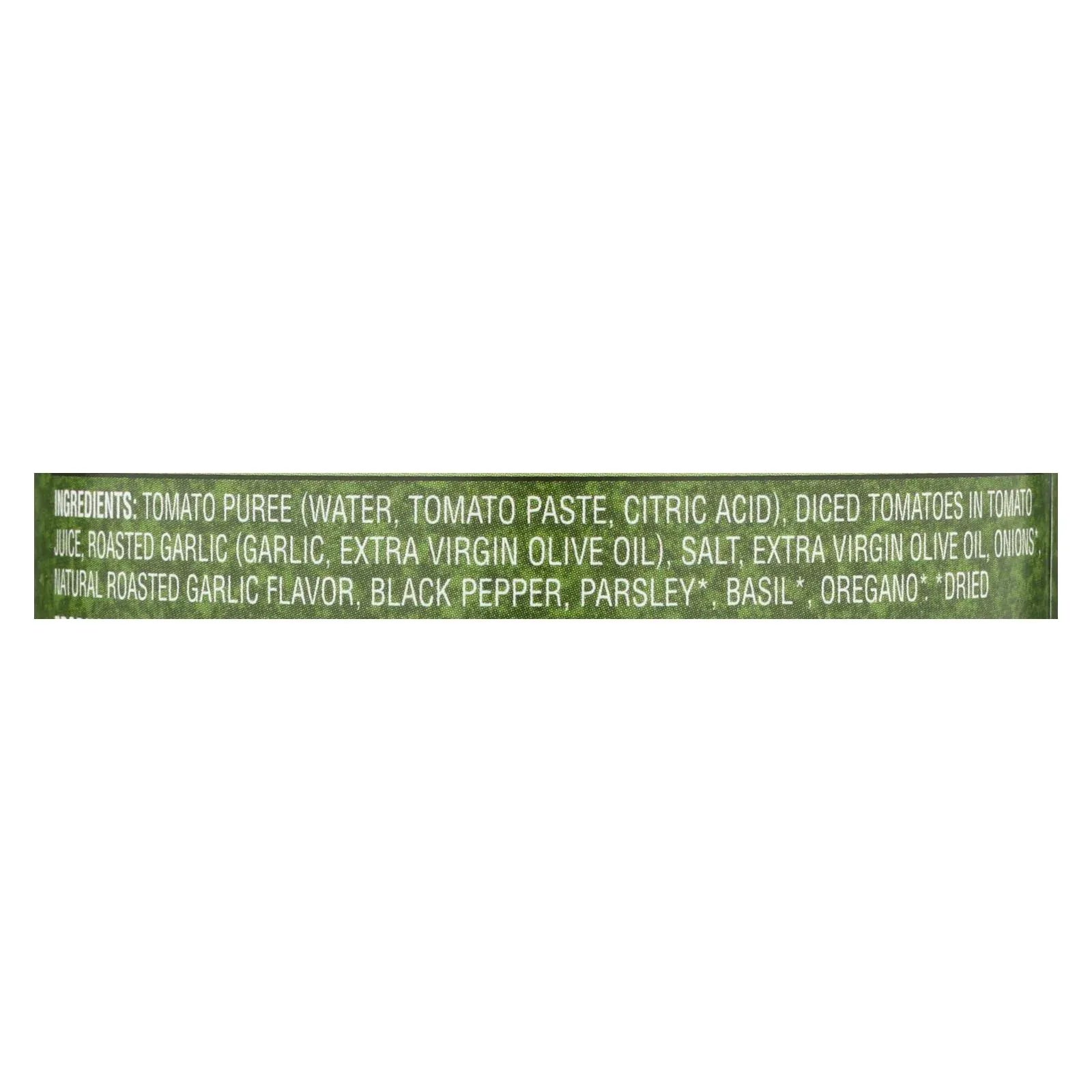 ingredients : tomato puree (water, tomato paste);diced tomatoes in tomato juice;roasted garlic;extra virgin olive oil;sea salt;onions;garlic;citric acid;black pepper;parsley;basil;fennel seed