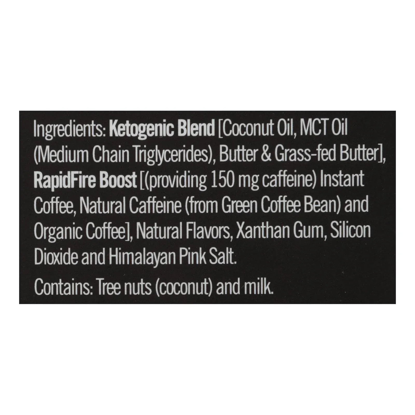 ingredients : ketogenic blend [coconut oil, mct oil (medium chain triglycerides), butter & grass-fed butter];rapidfire boost [(providing 150 mg caffeine) instant coffee, natural caffeine (from green coffee bean) and organic coffee];natural flavors;xanthan gum;silicon dioxide and himalayan pink salt