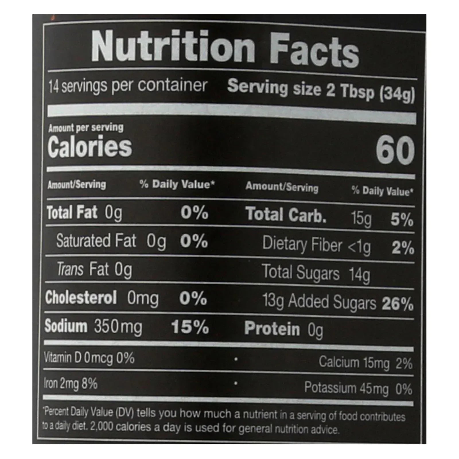 ingredients : tomato puree (tomato paste, water);sugar;brown sugar;water;molasses;distilled vinegar;salt;raisin paste;orange juice (from concentrate);tamed soy sauce (water, soybeans, salt, sugar);dried onion;chipotle pepper;natural flavor;smoke flavor;spices (including mustard flour);garlic powder;celery seed