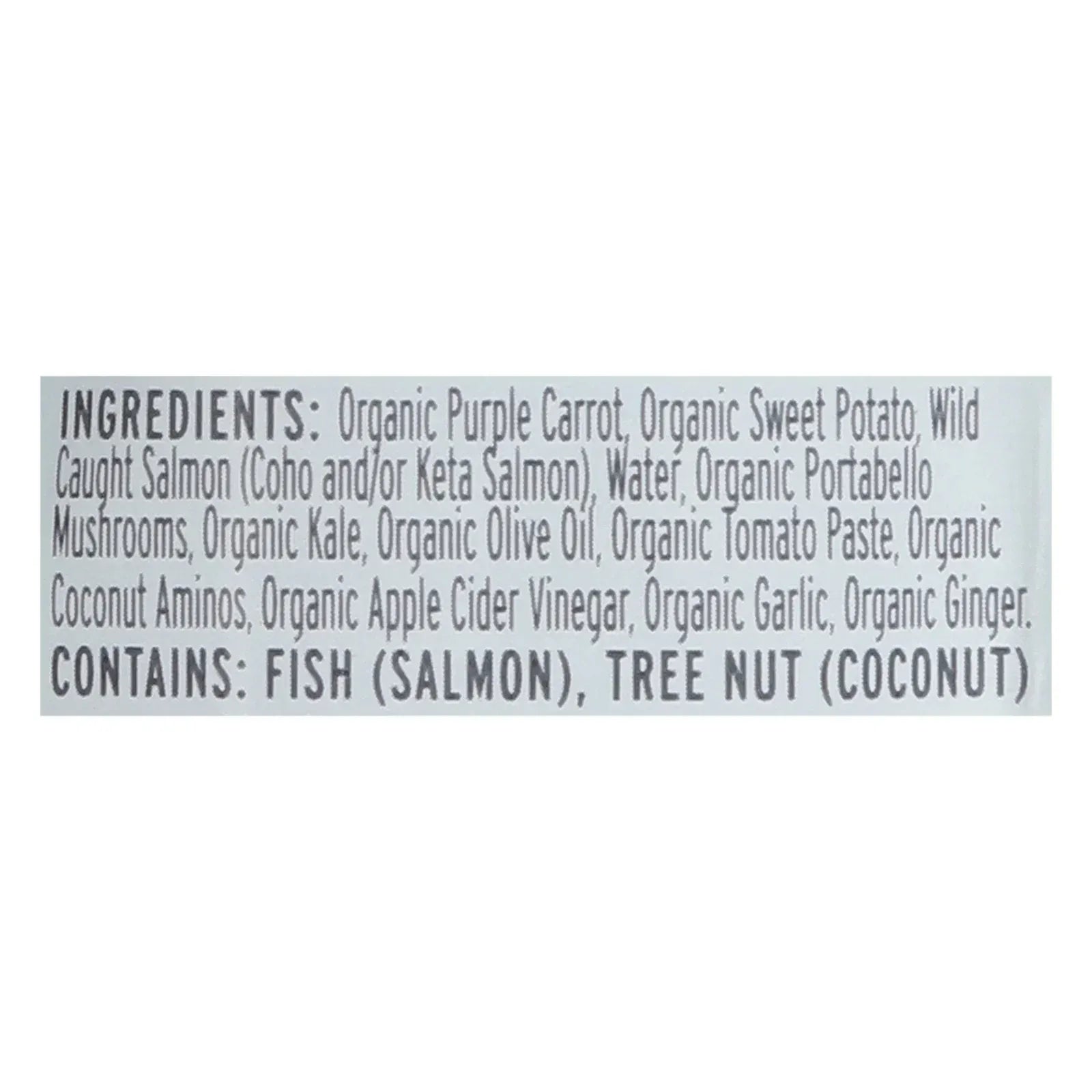 ingredients : organic purple carrot;organic sweet potato;wild caught salmon (coho and/or keta salmon);water;organic portabello mushrooms;organic kale;organic olive oil;organic tomato paste;organic coconut aminos;organic apple cider vinegar;organic garlic;organic ginger