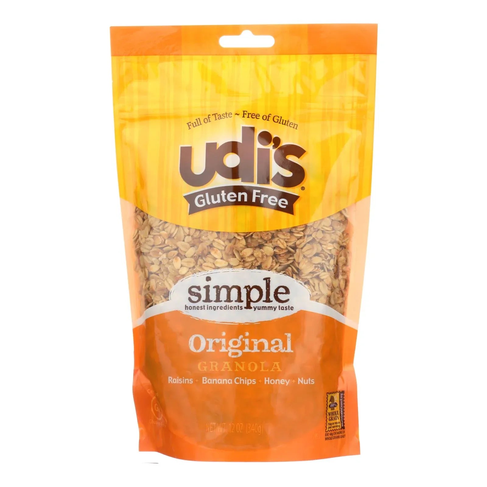 Udi's original granola is gluten-free and kosher, so people with some dietary restrictions can enjoy it. We make our granola with whole grains for more nutrients than refined grain. Each 12 oz. Bag of granola contains raisins, banana chips, honey and nuts with 140 calories per serving. See nutrition facts panel for allergens.
