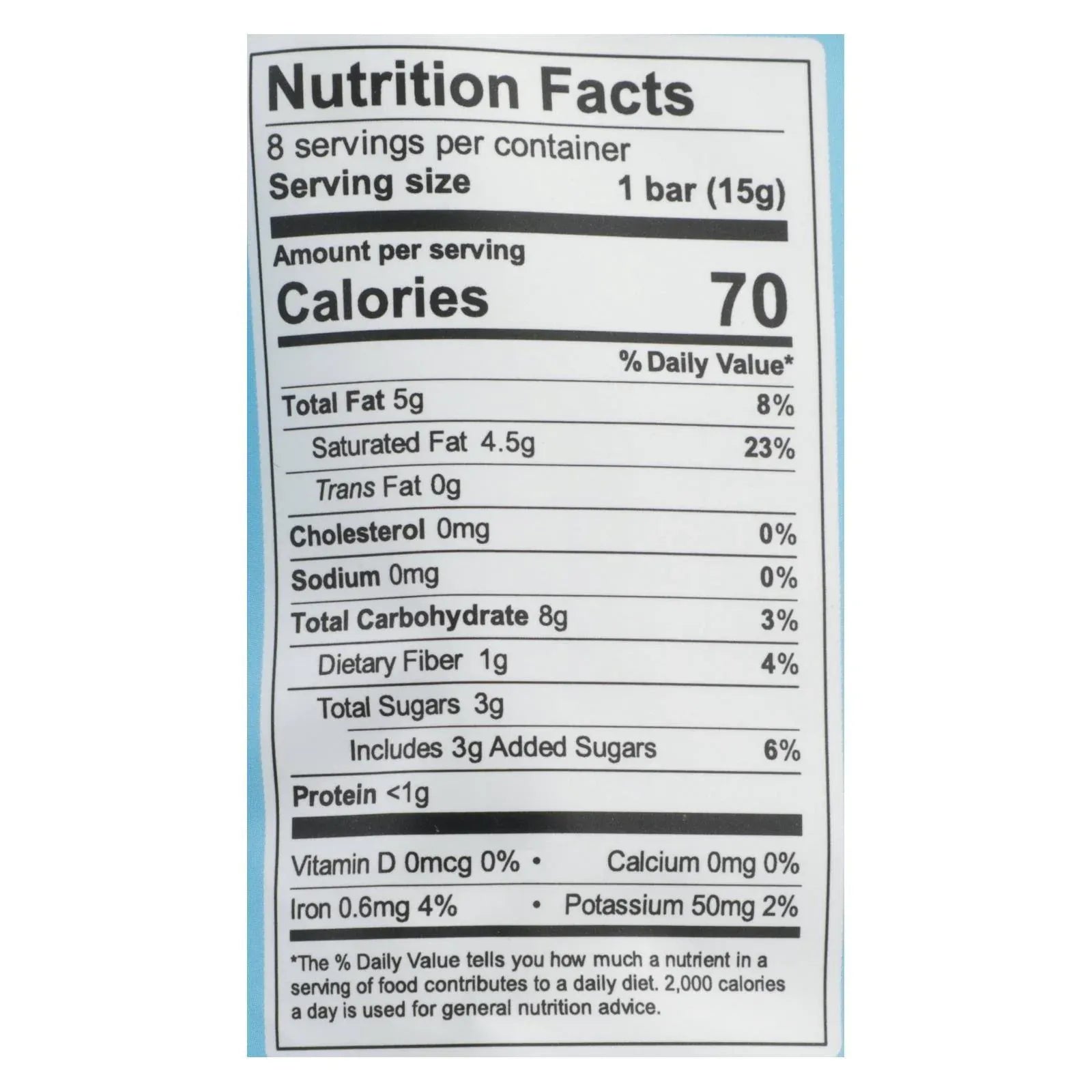 ingredients : organic coconut;organic cassava syrup;dark chocolate (chocolate liquor , cane sugar , cocoa butter , vanilla)