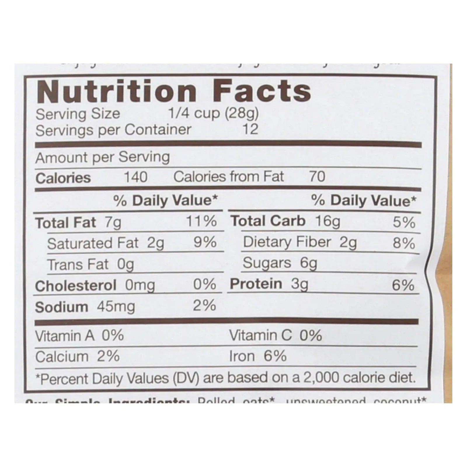 ingredients : organic gluten-free oats;organic brown sugar;expeller-pressed non-gmo canola oil;walnuts;organic unsweetened coconut;organic seedless raisins;organic sunflower seeds;spices;sea salt;pure vanilla extract