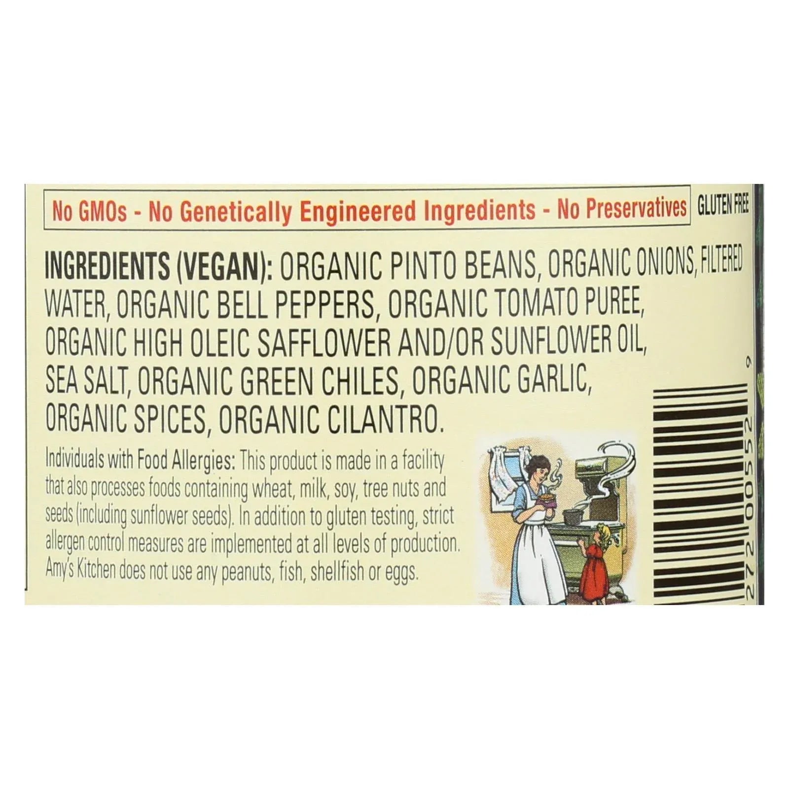 ingredients : organic pinto beans;organic onions;filtered water;organic bell peppers;organic tomato puree;organic high oleic safflower and/or sunflower oil;sea salt;organic green chiles;organic garlic;organic spices;organic cilantro