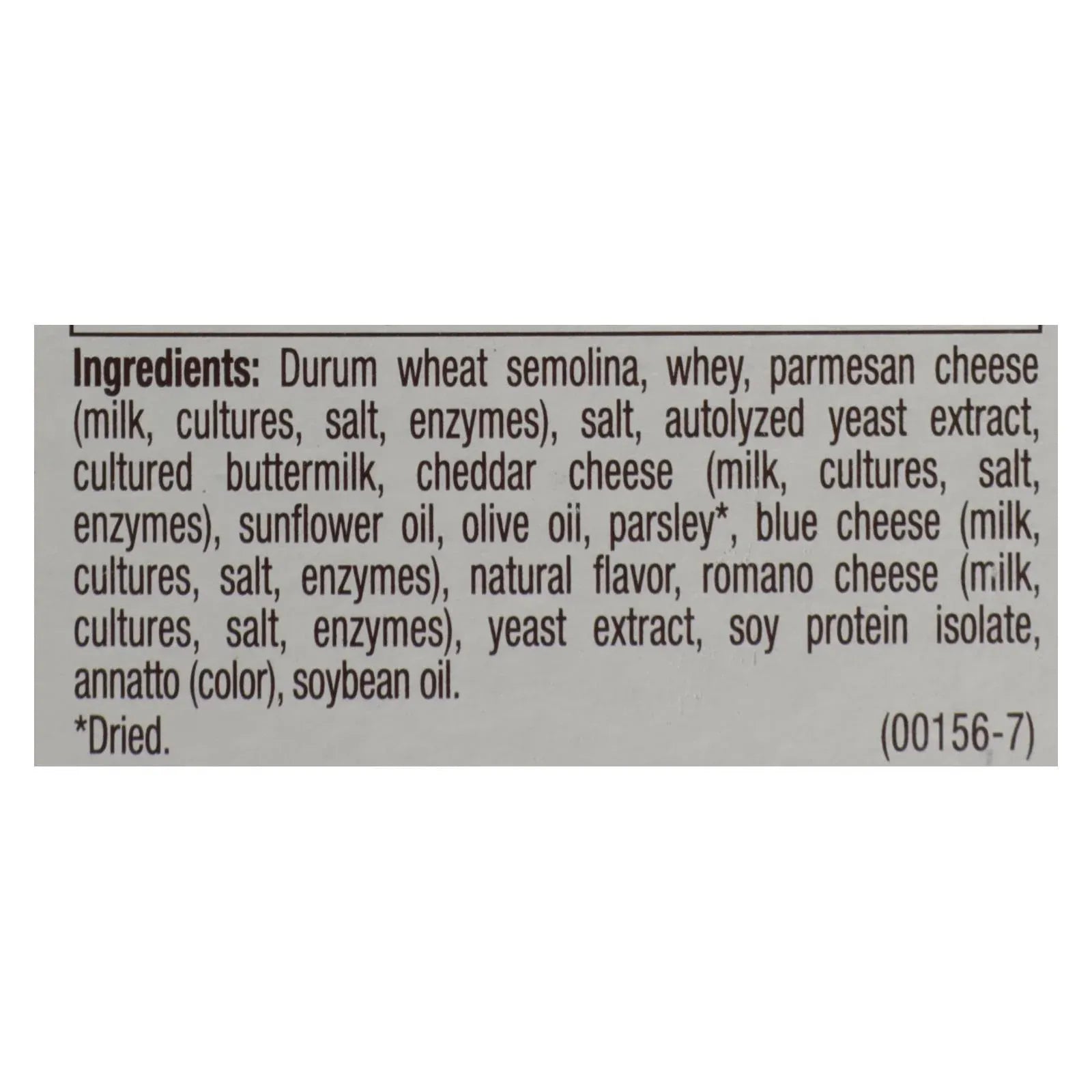 ingredients : durum wheat semolina;whey;parmesan cheese;milk;cultures;salt;enzymes;autolyzed yeast extract;cultured buttermilk;cheddar cheese;sunflower oil;olive oil;parsley;blue cheese;natural flavor;romano cheese;yeast extract;soy protein isolate;annatto;color;soybean oil