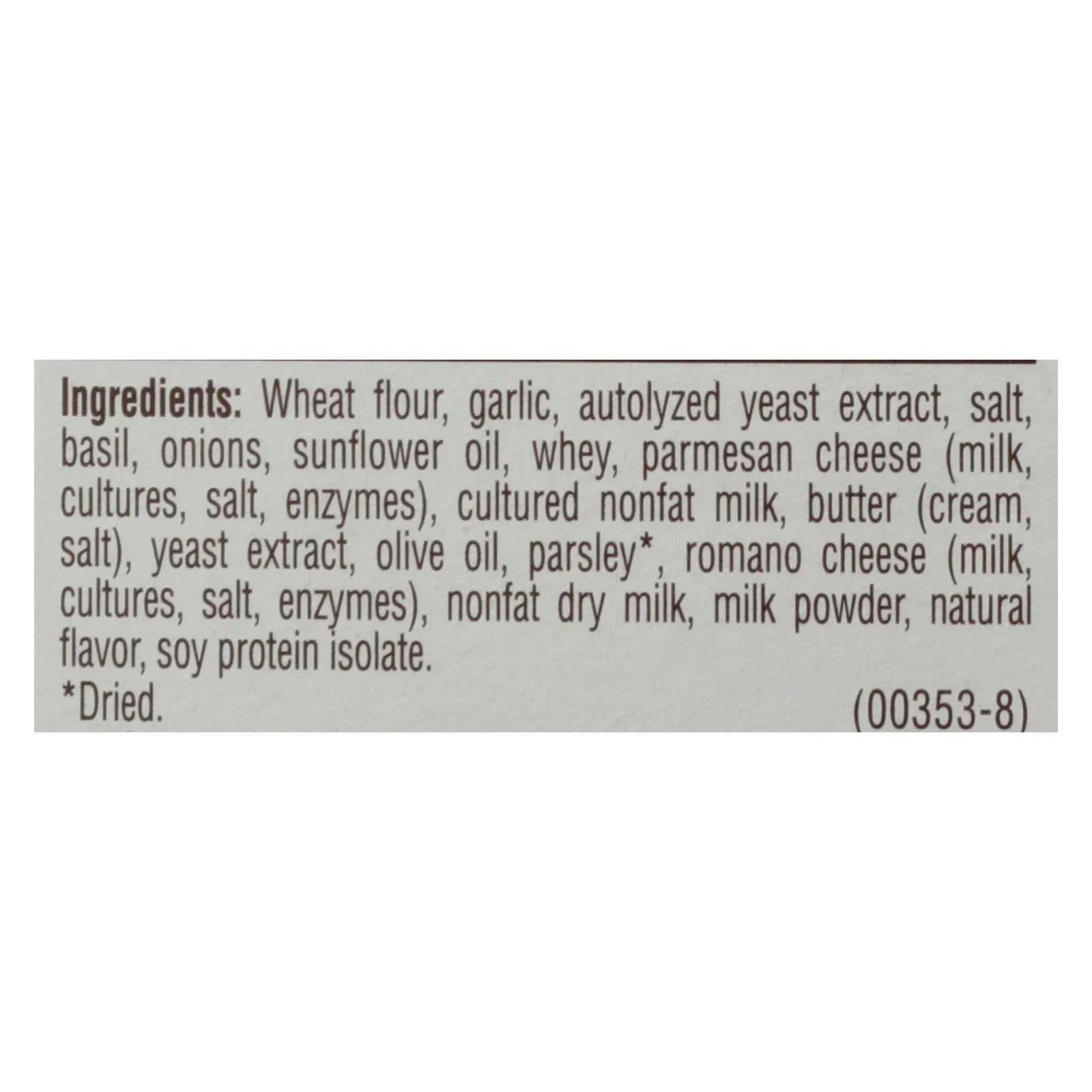 ingredients : wheat flour;garlic;autolyzed yeast extract;salt;basil;onions;sunflower oil;whey;parmesan cheese;milk;cultures;enzymes;cultured nonfat milk;butter;cream;yeast extract;olive oil;parsley;romano cheese;nonfat dry milk;milk powder;natural flavor;soy protein isolate