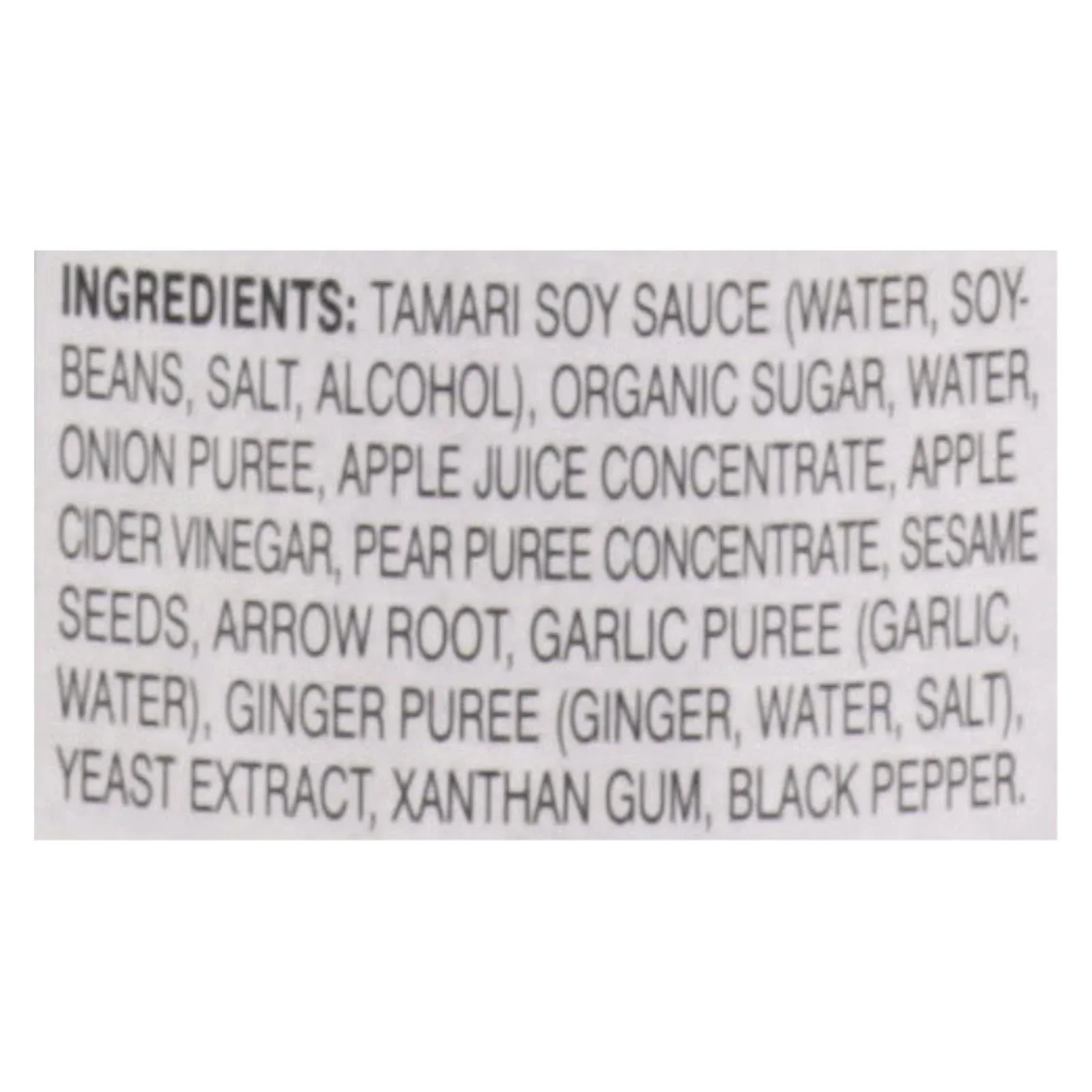 ingredients : tamari soy sauce;water;soy beans;salt;alcohol;organic sugar;onion puree;apple juice concentrate;apple cider vinegar;pear puree concentrate;sesame seeds;arrow root;garlic puree;garlic;ginger puree;ginger;yeast extract;xanthan gum;black pepper