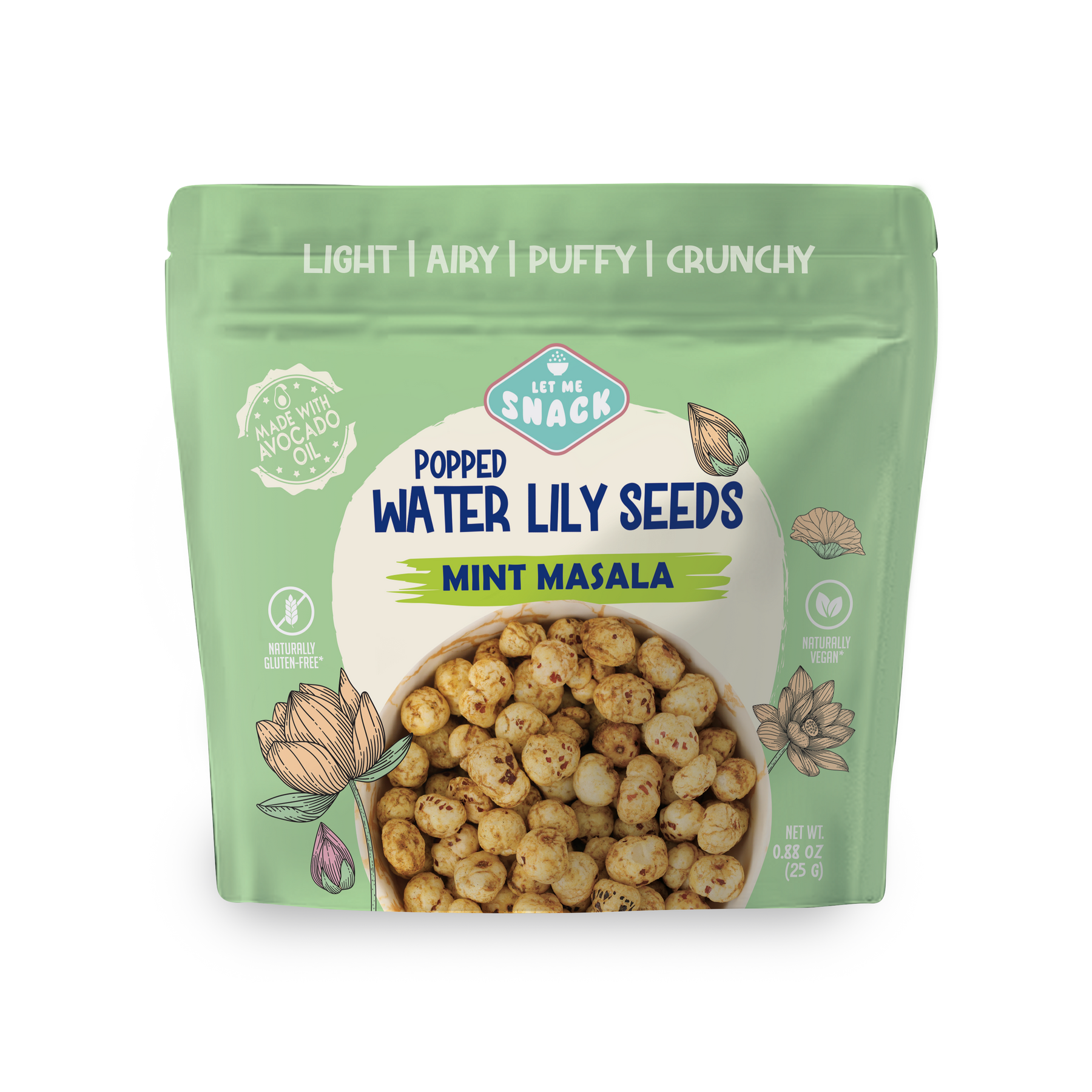 Ingredients:Β Popped Water lily seeds, Avocado oil, Chat Masala (Salt White, dehydrated Unripe Mango, Salt Black, Coriander, Musk Melon, Black Pepper, Mint Leaves, Dried Ginger, Yellow Chilli, Bishop's Weed Spice, Cloves, Nutmeg, Asafoetida, Caraway), 100% Natural Mint Leaves Powder, Salt, Cumin, Turmeric