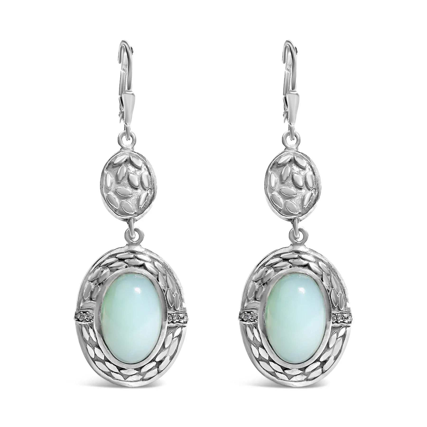 Entwine elegance and a whisper of enchantment on your ears with these stunning drop and dangle earrings, masterfully crafted from rhodium-plated .925 sterling silver. Each earring cradles a large, oval-cut Chalcedony, natural in origin and heat-treated to enhance its mesmerizing greenish-gray hue, measuring an impressive 13x18 mm. These cabochon-cut jewels, together weighing approximately 20 carats, serve as the heart of the piece, exuding a serene yet commanding presence. Sparkling around these milky stones are delicate, natural diamonds, modest in size but significant in impact with a clarity of I1-I2 and a subtle K-L color that contrasts beautifully against the cool tones of the Chalcedony. Measuring approximately 2 1/4 inches in length, these earrings are designed to sway gently from secure leverbacks.