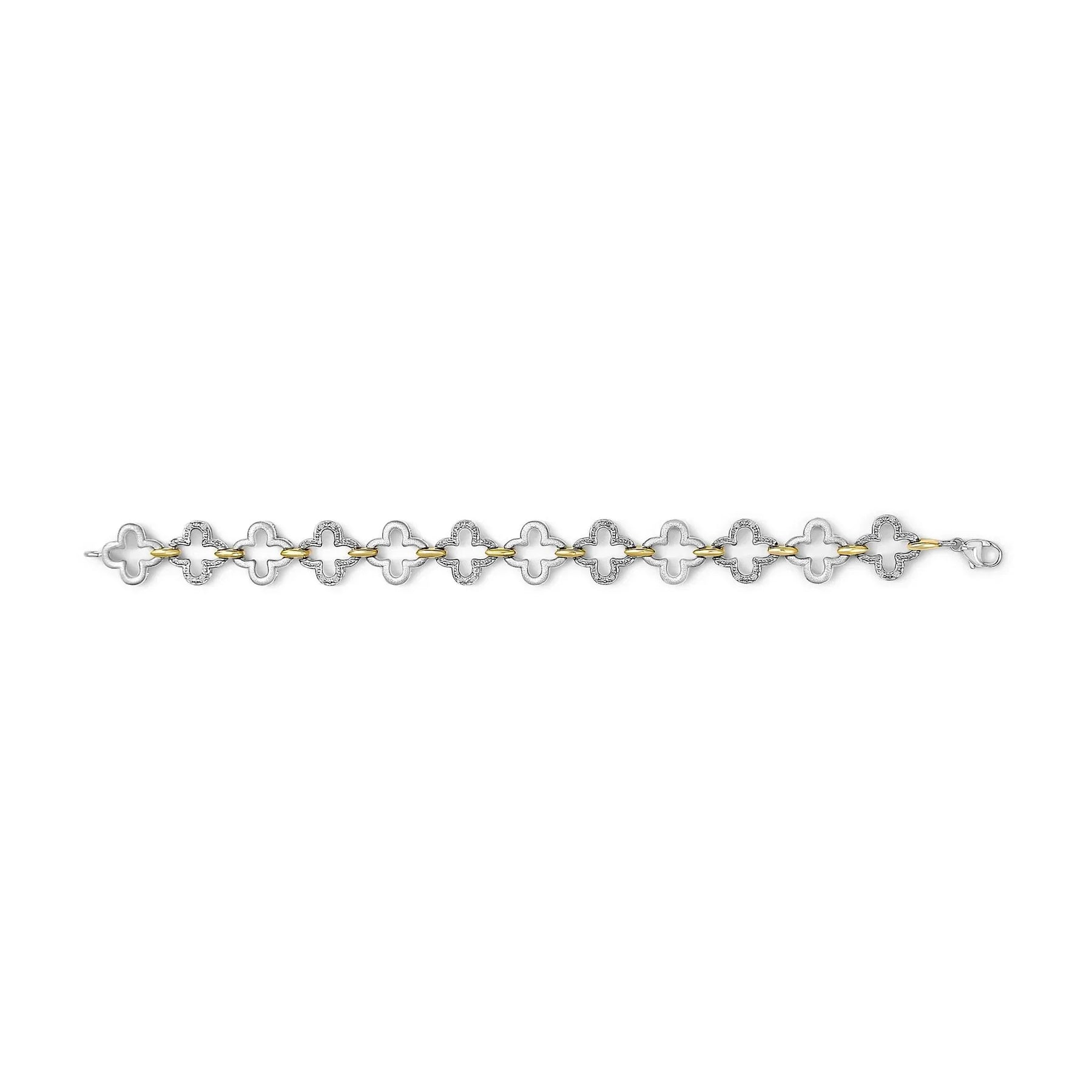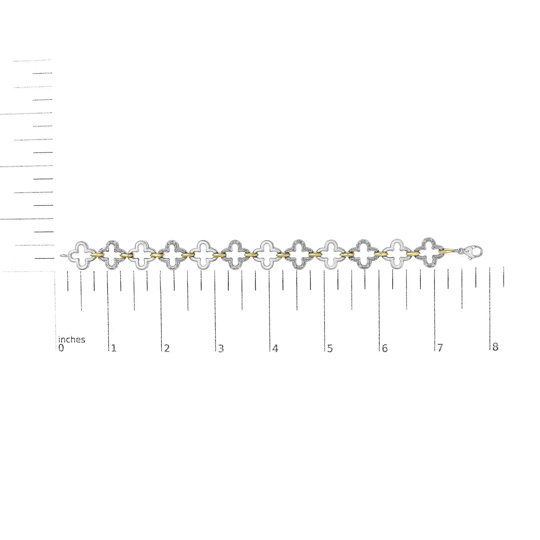 Experience the refined allure of this .925 two-tone sterling silver tennis bracelet, where craftsmanship meets a modern aesthetic. Designed to gleam under any light, the bracelet alternates between rhodium-plated silver and intricately gold-plated links, forming an enchanting dance of colors. Wisps of natural diamonds, totaling 1/10 cttw, nestled within clover-shaped frames, introduce a celestial sparkle, while sections of matte finish offer a tactile contrast, enhancing the bracelet's visual depth. Ideal for wrists up to 7.25 inches, the secure clasp promises a fit both snug and comfortable, ensuring that elegance accompanies you with every gesture. Embrace this piece as not only an accessory but a testament to exquisitely balanced design.