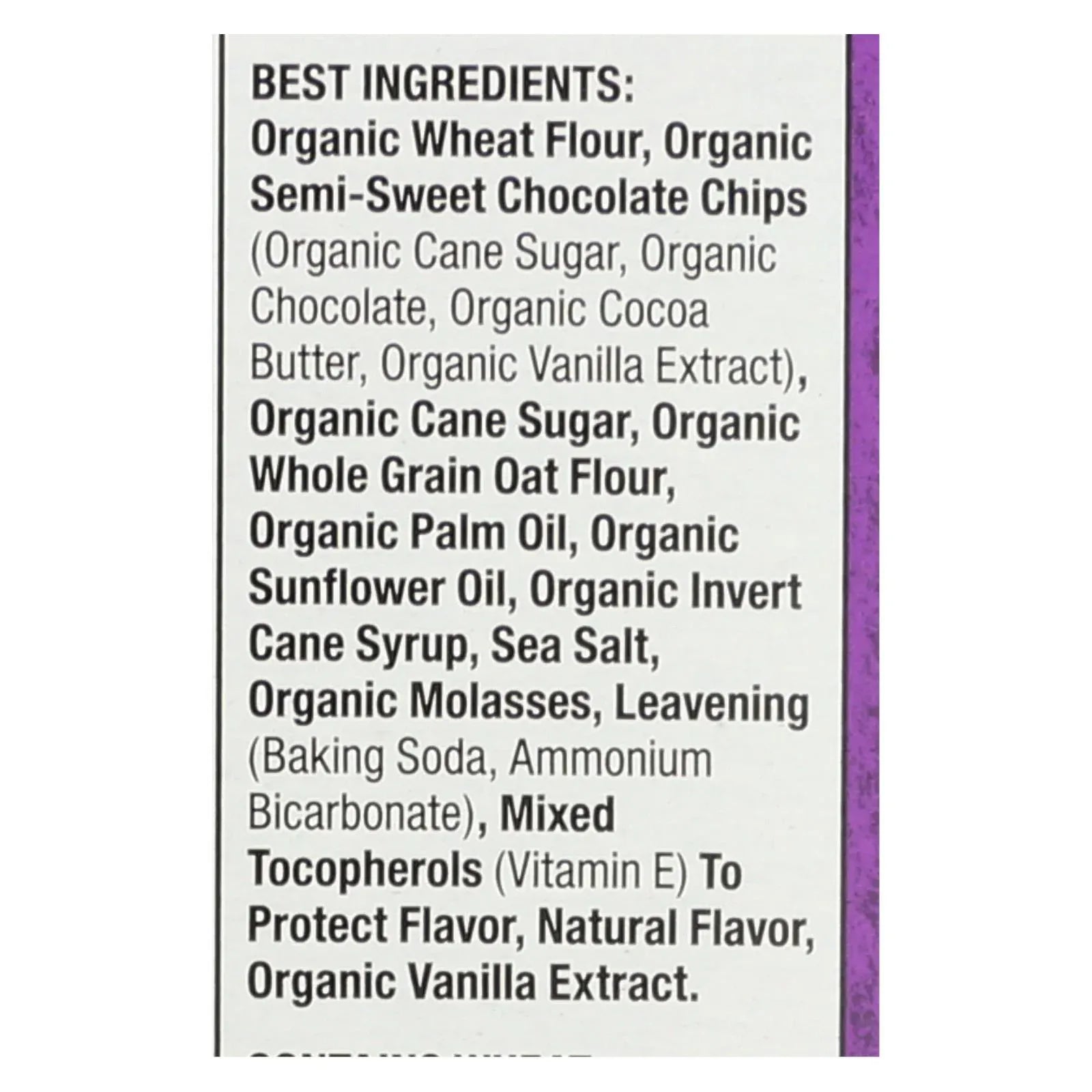 ingredients : best organic wheat flour;organic semi-sweet chocolate chips (organic cane sugar, organic chocolate, organic cocoa butter, organic vanilla extract);organic cane sugar;organic whole grain oat flour;organic palm oil;organic sunflower oil;organic invert cane syrup;sea salt;organic molasses;leavening (baking soda, ammonium bicarbonate);mixed tocopherols (vitamin e) to protect flavor;natural flavor;organic vanilla extract