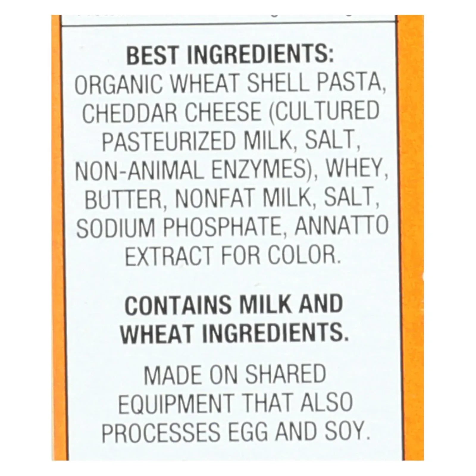 ingredients : best : organic wheat shell pasta;cheddar cheese;cultured pasteurized milk;salt;non-animal enzymes;whey;butter;nonfat milk;sodium phosphate;annatto extract for color