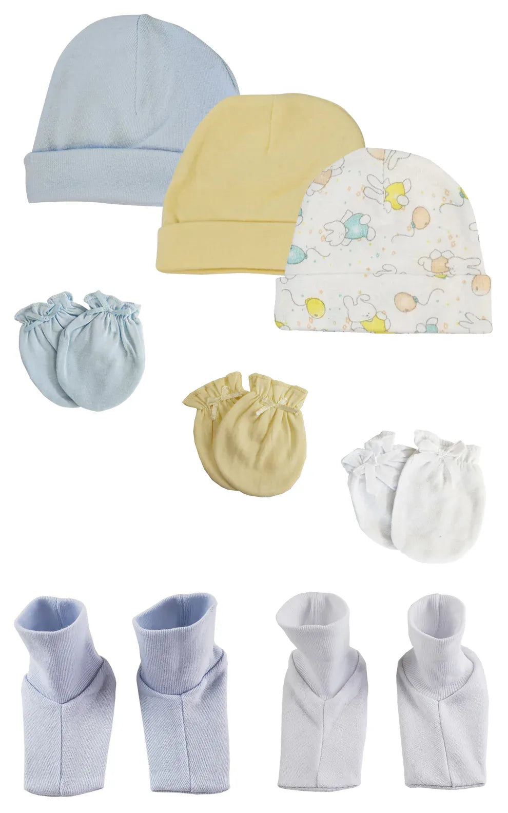 Yellow Baby Cap (100% Cotton), Printed Baby Cap (100% Cotton), Blue Baby Cap (100% Cotton), Blue Infant Mittens (Jersey), Yellow Infant Mittens (Jersey), Yellow Infant Mittens (Jersey), White Booties (100% Cotton), Blue Booties (100% Cotton)