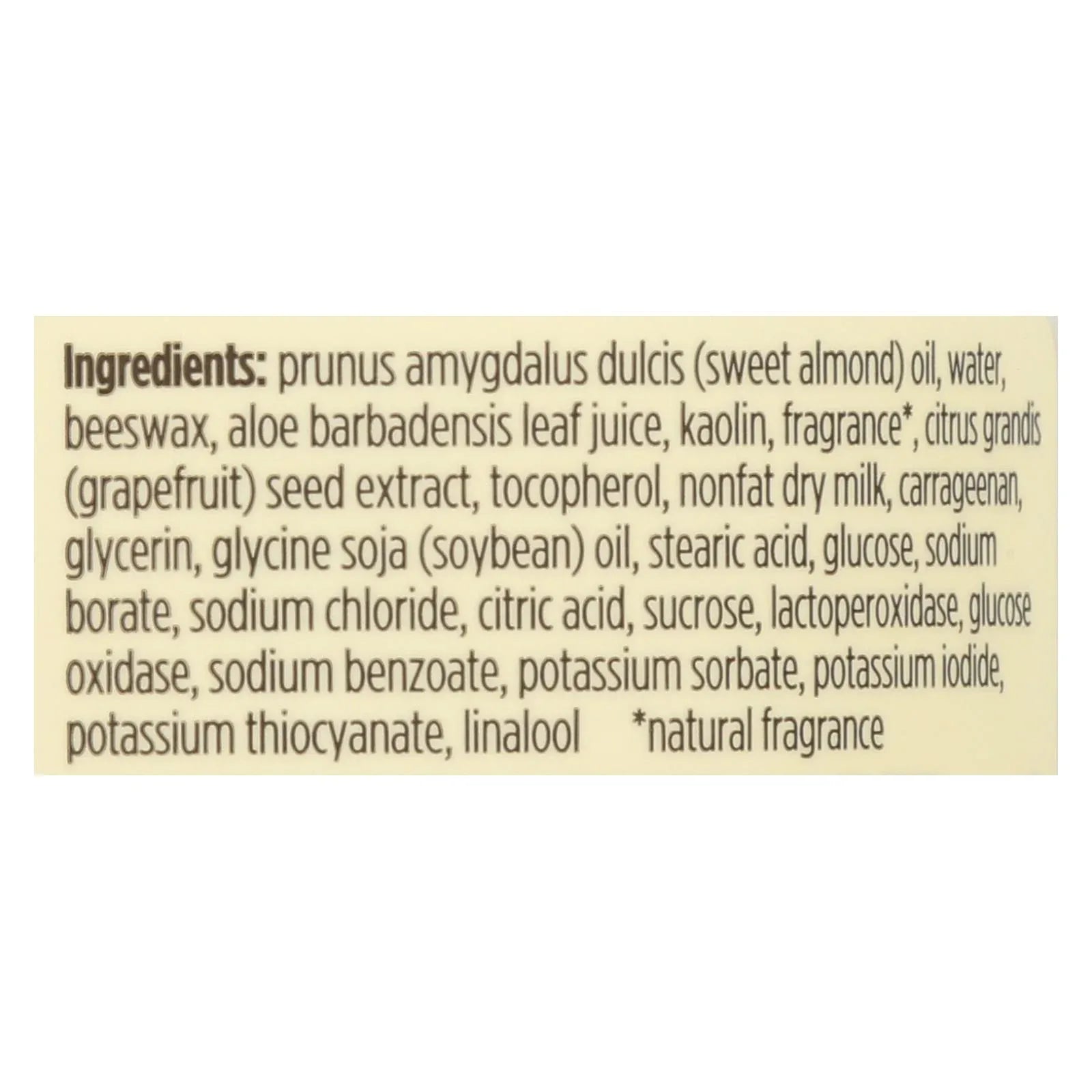 ingredients : prunus amygdalus dulcis (sweet almond) oil;water;beeswax;polyglyceryl-3 oleate;aloe barbadensis leaf juice;kaolin;nonfat dry milk;stearic acid;fragrance;lonicera japonica (honeysuckle) flower extract;tocopherol;lonicera caprifolium (honeysuckle) flower extract;sodium phytate;glycine soja (soybean) oil;citric acid;carrageenan;potassium sorbate;sodium benzoate;sucrose;alcohol;lecithin;ascorbyl palmitate;glyceryl oleate;glyceryl stearate;phenoxyethanol;eugenol;linalool