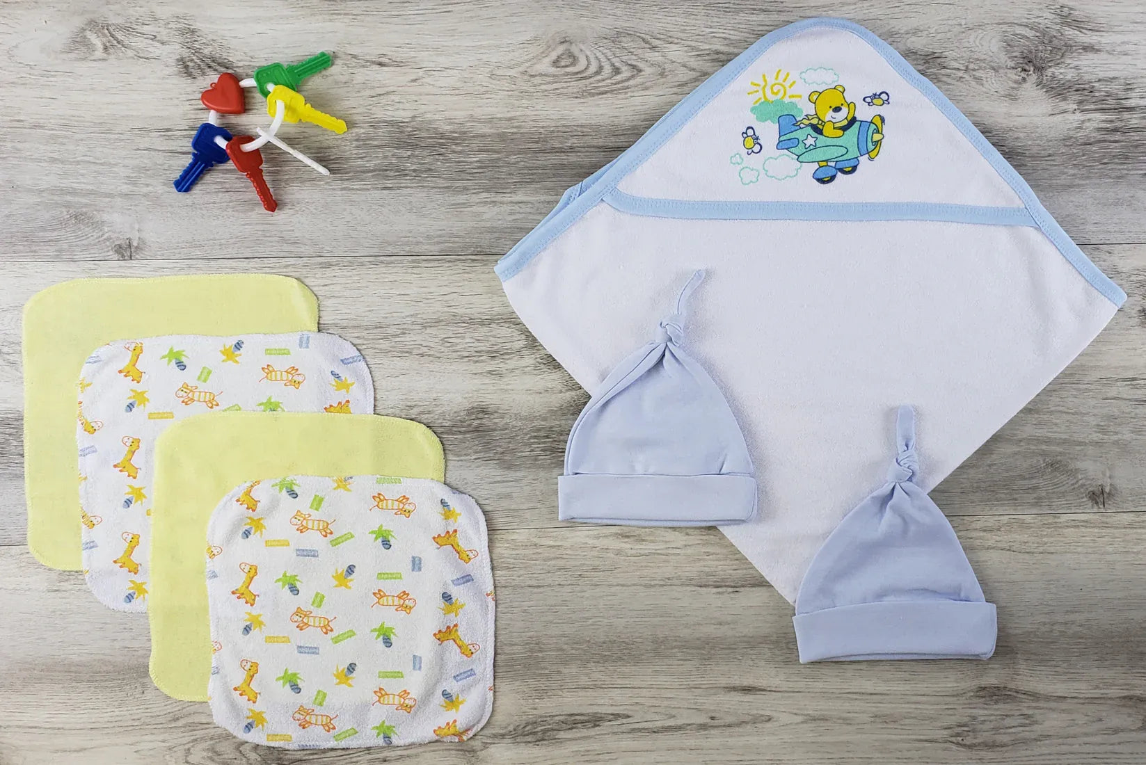 Terry Hooded Towel With Screen Prints (80% Cotton / 20% Polyester), Blue Knotted Baby Cap (100% Cotton), Blue Knotted Baby Cap (100% Cotton), Four Piece Wash Cloth Set (80% Cotton / 20% Polyester Terry)