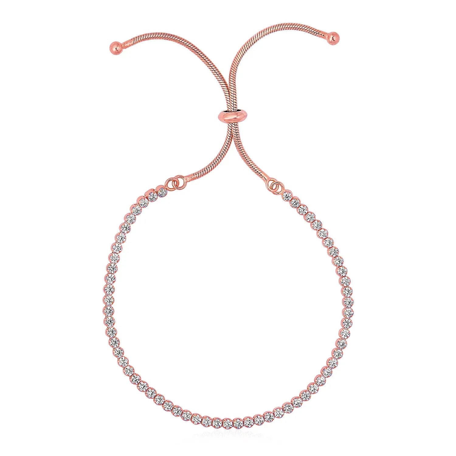 This updated, adjustable version of a classic tennis bracelet features Cubic Zirconia in rose-toned settings. Bracelet closes with a drawstring clasp.