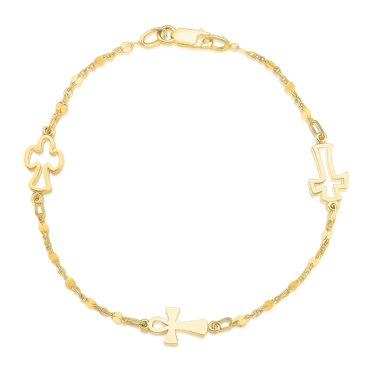 Our expertly crafted cross motif bracelet features interpretive crosses spaced at regular intervals across a link chain featuring small polished ovals. The variety of the motifs and the interesting chain make this a desirable piece of symbolic jewelry secured with a lobster clasp, the 14k yellow gold bracelet measures 7 inches in total length.