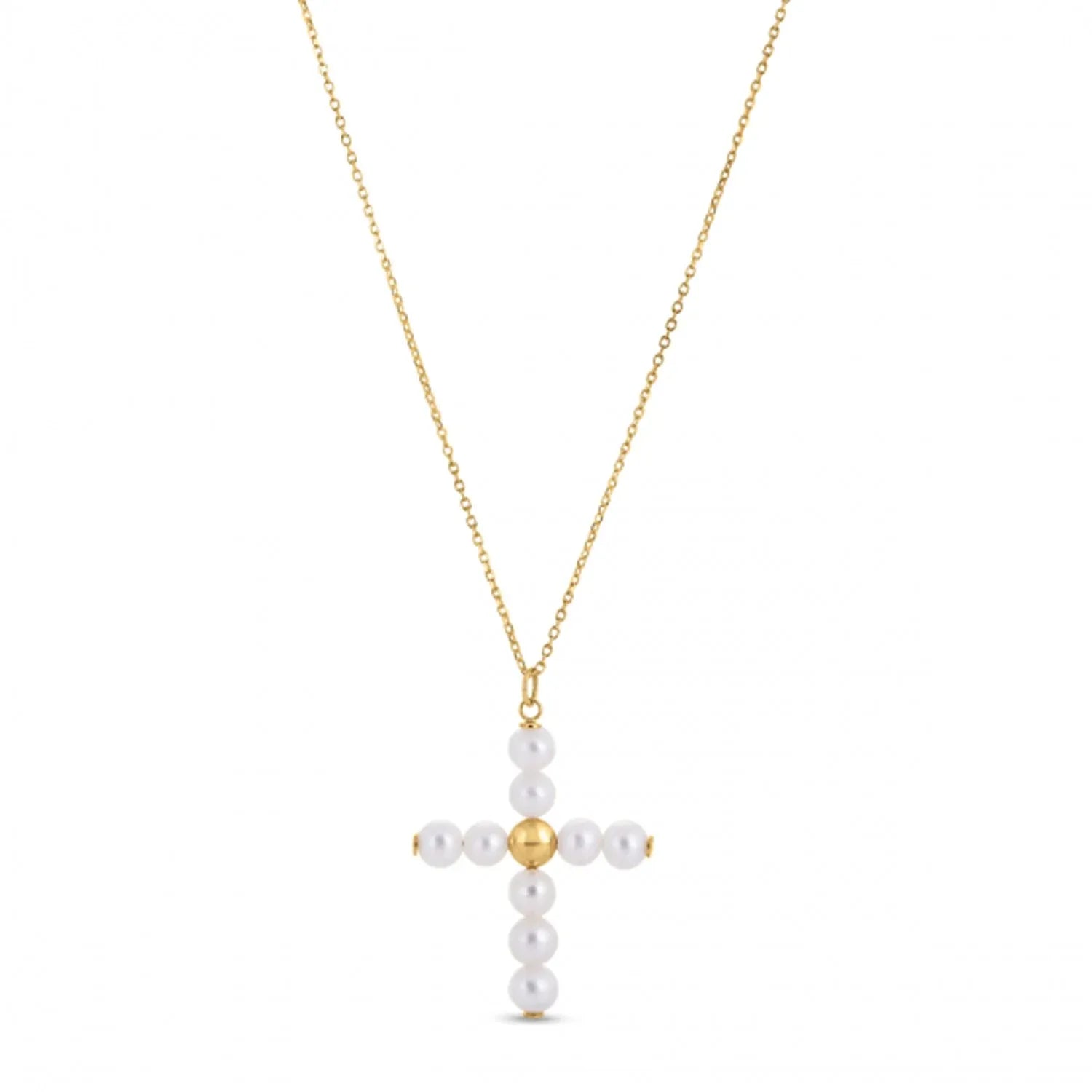 An image displaying 14k Yellow Gold Pearl Cross Pendant by Orca Market