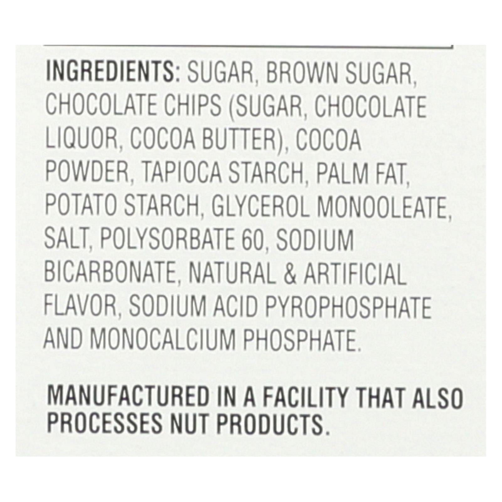 ingredients : sugar;brown sugar;chocolate chips;chocolate liquor;cocoa butter;cocoa powder;tapioca starch;palm fat;potato starch;glycerol monooleate;salt;polysorbate 60;sodium bicarbonate;natural & artificial flavor;sodium acid pyrophosphate and monocalcium phosphate