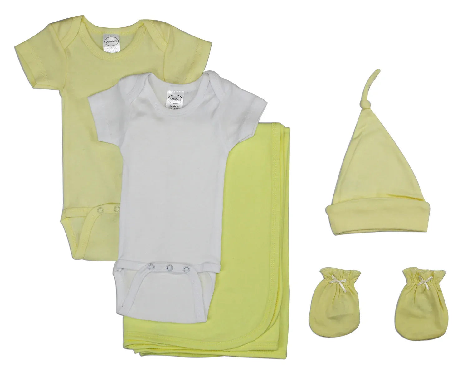 Short Sleeve Onezie Bodysuits (100% Cotton), Yellow Short Sleeve Onezies (100% Cotton), Yellow Knotted Baby Cap (100% Cotton), Yellow Infant Mittens (Jersey), Yellow Receiving Blanket (100% Cotton)