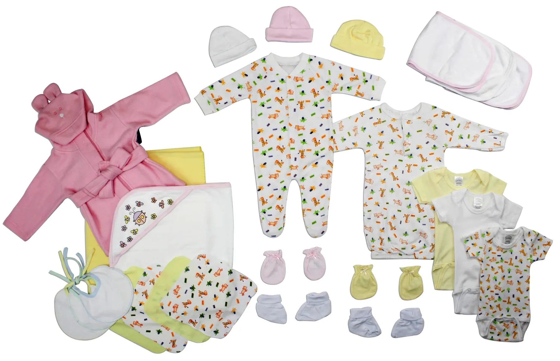 Terry Sleep 'n Play (Small 0-3M) (80% Cotton / 20% Polyester Terry), Printed Gown (100% Cotton), Short Sleeve Onezie 3 Pack (100% Cotton), Terry Burp Cloth with Pink Trim (80% Cotton / 20% Polyester Terry), Terry Burp Cloth with White Trim (80% Cotton / 20% Polyester Terry), Terry Burp Cloth with Pink Trim (80% Cotton / 20% Polyester Terry), Pink Infant Mittens (Jersey), Yellow Infant Mittens (Jersey), White Booties (100% Cotton), White Booties (100% Cotton), White Baby Cap (100% Cotton), Pink Baby Cap (100% Cotton), Yellow Baby Cap (100% Cotton), Yellow Polar Fleece Blanket (100% Cotton), Pink Fleece Robe With Hoodie (Polyester), Terry Hooded Towel With Screen Prints (80% Cotton / 20% Polyester), Four Piece Wash Cloth Set (80% Cotton / 20% Polyester Terry), Infant Three Piece Bib Set (80% Cotton / 20% Polyester Terry)