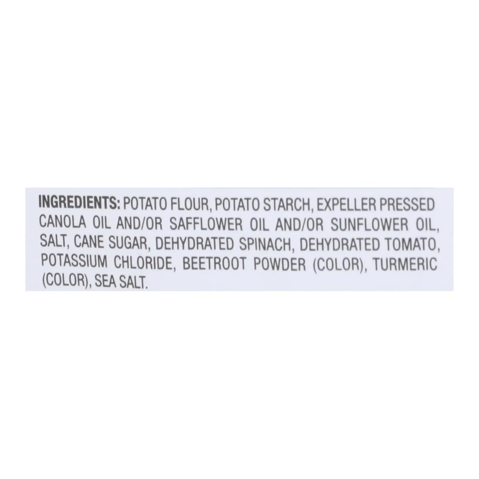 ingredients : potato flour;potato starch;expeller pressed canola oil and/or safflower oil and/or sunflower oil;salt;cane sugar;dehydrated spinach;dehydrated tomato;potassium chloride;beetroot powder;color;turmeric;sea salt