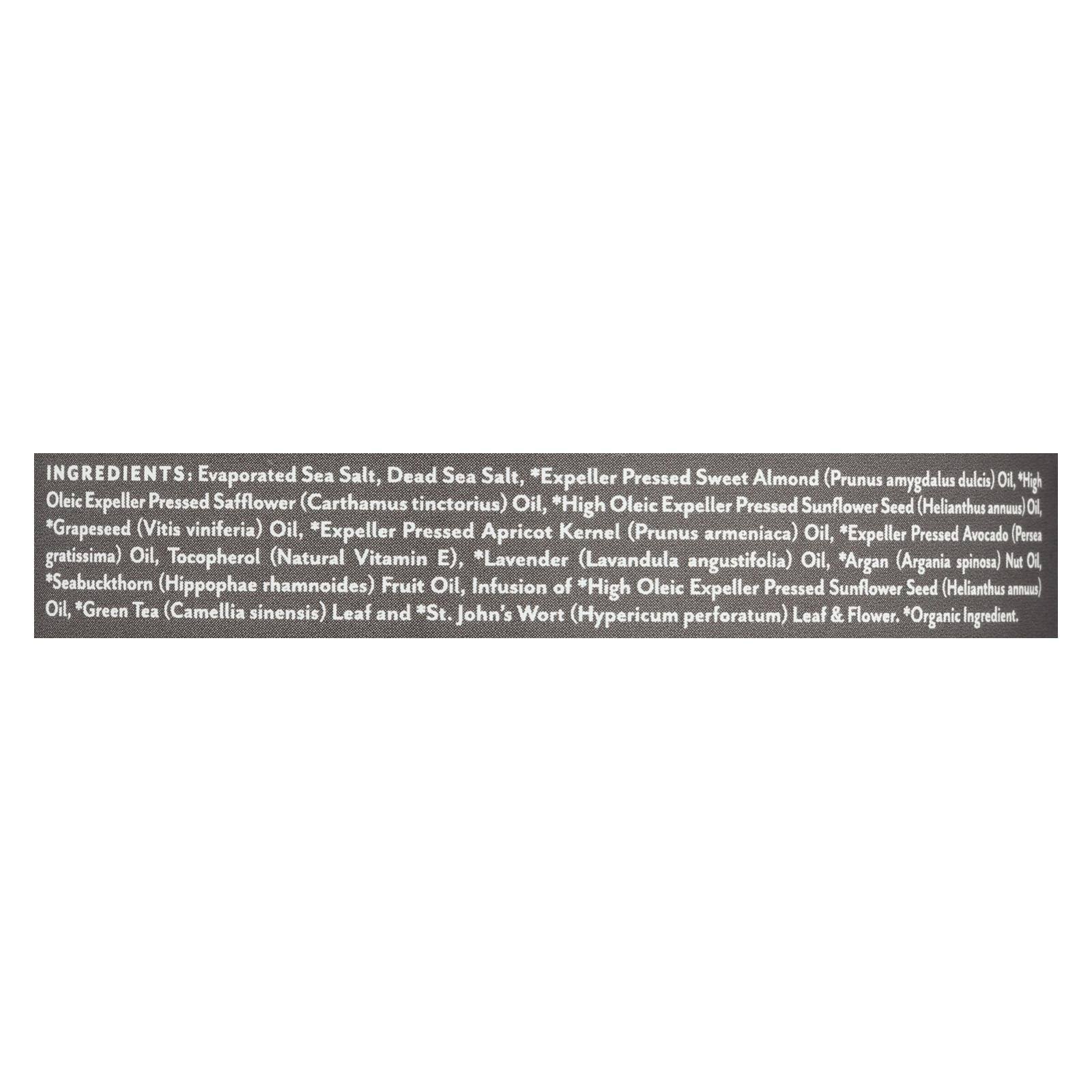 ingredients : evaporated sea salt;dead sea salt;expeller pressed sweet almond;prunus amygdalus dulcis;oil;high oleic expeller pressed safflower;carthamus tinctorius;high oleic expeller pressed sunflower seed;helianthus annuus;grapeseed;vitis vinifera;expeller pressed apricot kernel;prunus armeniaca;expeller pressed avocado;persea gratissima;tocopherol;natural vitamin e;lavender;lavandula angustifolia;argan;argania spinosa;nut oil;seabuckthorn;hippophae rhamnoides;fruit oil;infusion of *high oleic expeller pre