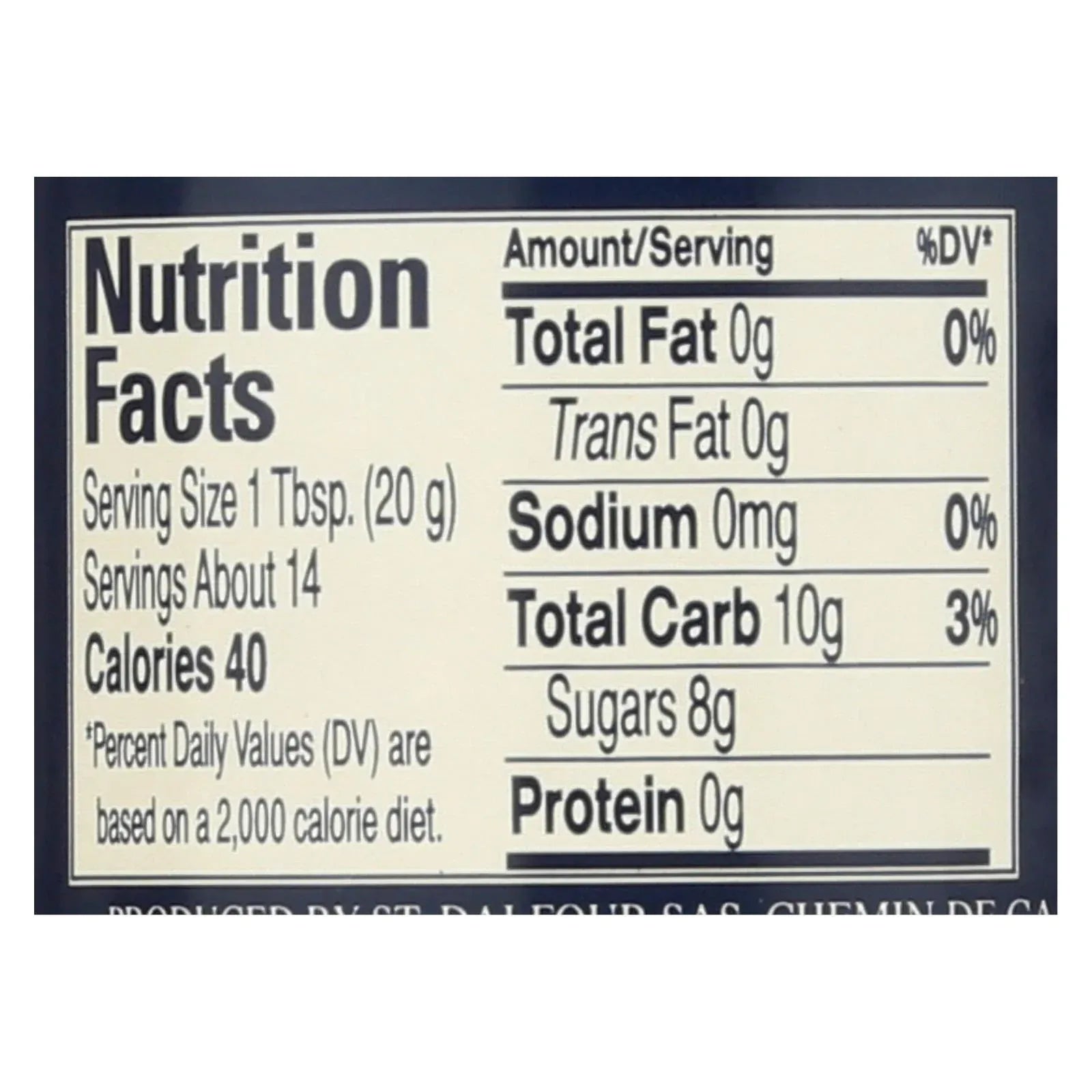 St. Dalfour golden peach fruit spread is made with peaches, fruit juice concentrates, fruit pectin and lemon juice. Each 10 oz. Jar contains 14 servings of about 1 tbsp. Each. Each serving of our peach fruit spread has 40 calories and 0 g. Total fat. Our delicious fruit spread is made in france by an old recipe.